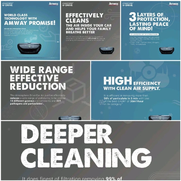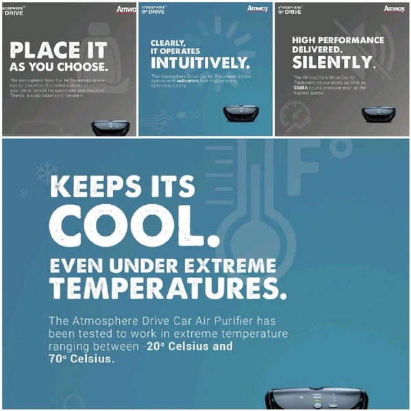 The Atmosphere Drive™ car air purifier by Amway, is a self-installed in-vehicle air purification system that leverages the proven Atmosphere™ filtration technology to provide cleaner air inside your car where the air quality can be up to 15 times6 worse than outside air